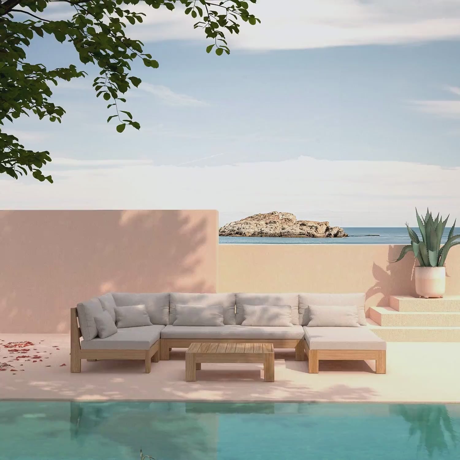 Hergestellt aus außergewöhnlichem massivem Akazienholz verkörpert es ein natürliches und zeitloses Design, bei dem jedes Detail durchdacht wurde, um Ästhetik und Langlebigkeit zu vereinen. Seine großzügigen breiten Sitzflächen, die durch wasserabweisende und abnehmbare Kissen veredelt werden, bieten unvergleichlichen Komfort, perfekt für Momente der Entspannung von absoluter Eleganz.